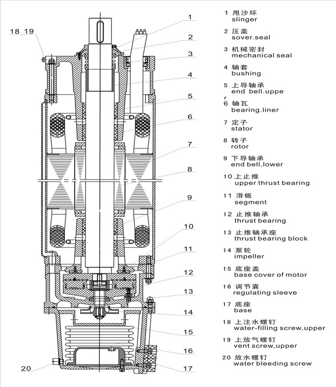 電動機(jī)機(jī)構(gòu) 1、 潛水電機(jī)由定子、轉(zhuǎn)子、上下導(dǎo)軸承、下連接法蘭、底座、軸伸密封裝置等組成。 2、 潛水電機(jī)各止口連接處采用密封圈密封;軸伸密封根據(jù)水質(zhì)含砂量多少,選擇不同方式的密封裝置。(含砂量大于0.01%時采用橡膠骨架油封;含砂量大于0.01-0.5%時采用機(jī)械密封) 3、 電動機(jī)下部裝有橡膠調(diào)節(jié)囊,其作用為當(dāng)電機(jī)內(nèi)部熱脹冷縮時及電機(jī)外部水位高低變化時,用以平衡電機(jī)內(nèi)腔與水的壓力。 4、 電動機(jī)定子繞組采用耐水絕緣線,有良好的絕緣能力,繞組線與耐水JHS型電纜連接。 5、 潛水電機(jī)上、下導(dǎo)軸承座內(nèi)裝有軸瓦,轉(zhuǎn)子下部裝有止推軸承。止推軸承由上、下止推軸承及滑板組成,用于承擔(dān)軸向力,上止推軸承為塊環(huán)形,下止推軸承為分塊扇形。 技術(shù)支持 1、保證電機(jī)的引出電纜處端電壓為380(1±5%)V,頻率為50(1±1%)HZ(其它電壓或頻率須特殊訂貨)。 2、電機(jī)的******運(yùn)行電流不得大于銘牌上的標(biāo)定值(即額定電流,配套廠家和用戶在選用和調(diào)試潛水電泵機(jī)組的電源控制設(shè)備時,應(yīng)特別注意); 3、電機(jī)應(yīng)選用合適的控制方式(可實現(xiàn)電機(jī)的過載、欠壓、斷相運(yùn)行的保護(hù)并可根據(jù)水位自動控制電泵的起停); 4、電機(jī)為連續(xù)工作制(S1)。兩次起動時間間隔不得小于10分鐘; 5、電機(jī)應(yīng)可豎直使用,也可臥式使用(須特殊訂制); 6、用于水池或超過規(guī)定的井徑中時應(yīng)加裝吸水罩,使電機(jī)表面的水流速度達(dá)到0.5-1m/s,以保證電機(jī)良好的散熱。吸水罩應(yīng)將電動機(jī)和第一,二級泵包括在內(nèi)。 供貨范圍 潛水電機(jī)主機(jī)(包括3米引纜),電纜的接頭絕緣粘帶(包括優(yōu)質(zhì)聚氯乙烯粘帶、自熔乙丙膠帶、丁基橡膠自粘帶)使用維護(hù)說明書1份,合格證1份裝箱單1份,木箱包裝 注:當(dāng)環(huán)境水或電網(wǎng)電壓、頻率不符合上述規(guī)定時,用戶可以提出要求,本公司提供訂制適用產(chǎn)品。